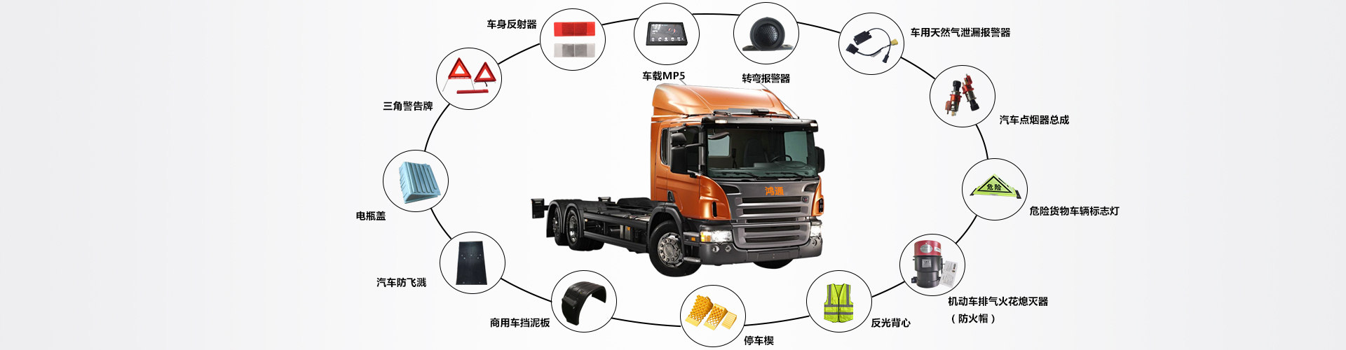公司主要产品有轮罩、电瓶箱盖、汽车防飞溅、停车楔、右转弯报警器、三角警告牌、反光衣、回复反射器、灭火器、汽车安全带、警示灯、危险货物车辆标志灯、机动车排气火花熄灭器(防火帽)等,主要为国内各大主机厂配套供货。