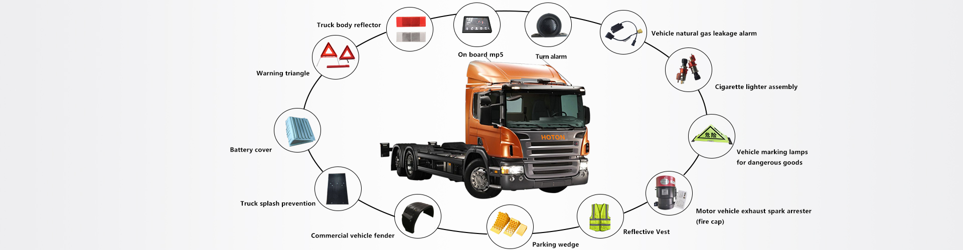 The company's main products include wheel covers, battery box covers, automobile anti splash, parking wedges, right turn alarms, triangle warning signs, reflective clothing, retro reflectors, fire extinguishers, automobile safety belts, warning lights, dangerous goods vehicle signs, motor vehicle exhaust spark extinguishers (fire caps), etc......